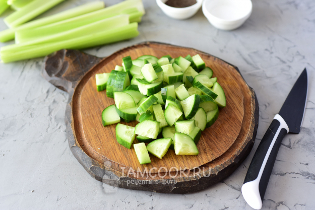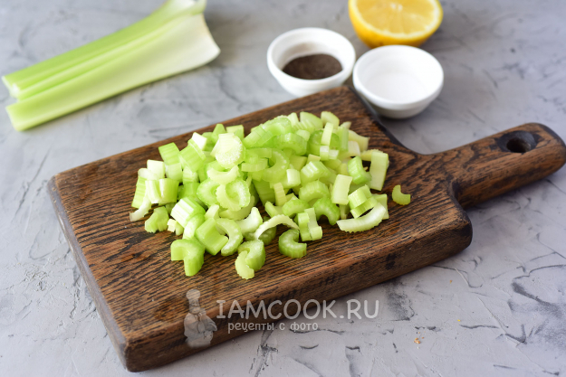 Стебли сельдерея нашинкуем кусочками среднего размера.