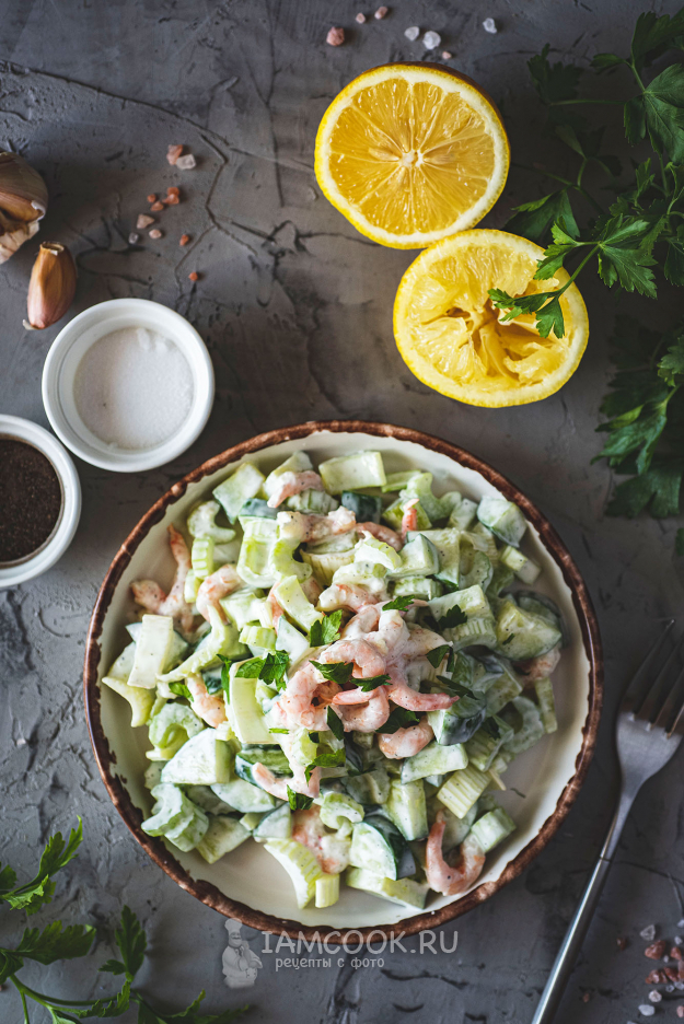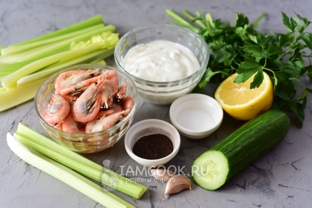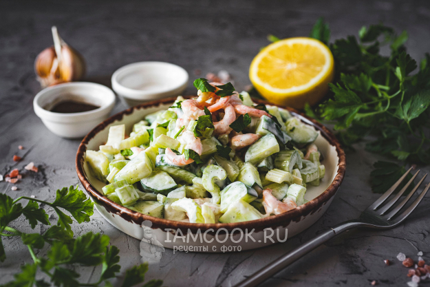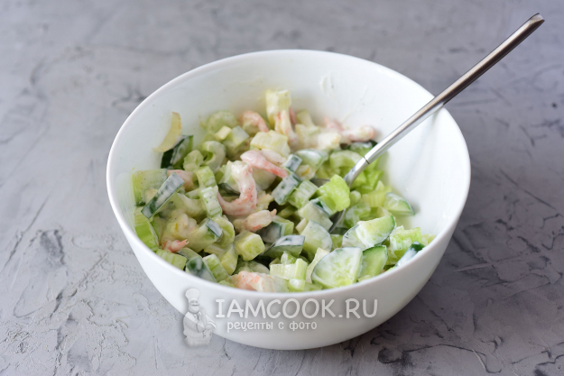 В салатную миску выложим нарезанные огурцы и сельдерей. Почистим креветок и ополоснем их в проточной воде, выложим к остальным ингредиентам.