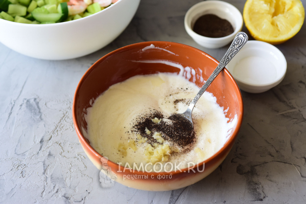 Приготовим для салата заправку. В миску выложим йогурт или нежирную сметану, выдавим туда сок из половинки лимона, добавим соль, черный перец и выдавим очищенный зубчик чеснока. Перемешаем.