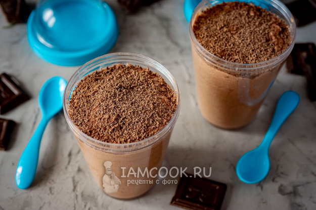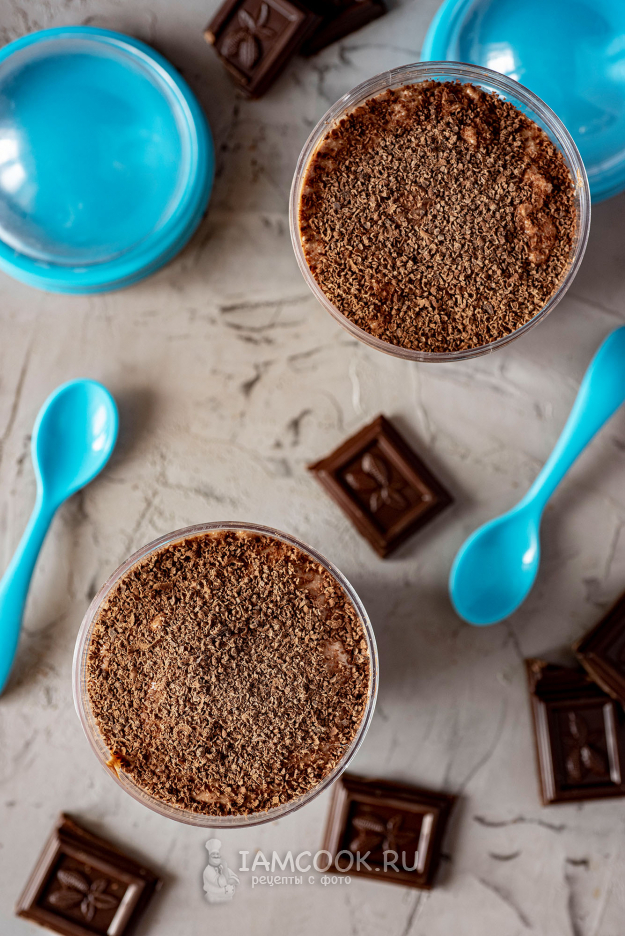 Через 10 минут в комнатных условиях творожно-шоколадный мусс уже застыл. Присыплем поверхность десерта тертым шоколадом и подадим к столу.