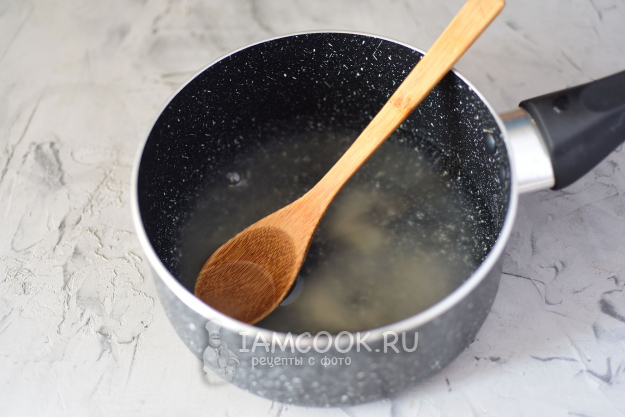 В сотейник зальем воду и размешаем в ней агар-агар, поставим на средний огонь, дождемся момента закипания и будем, постоянно мешая ложкой, варить примерно 3-5 минут.
