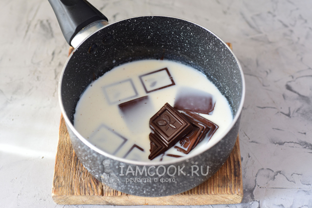 В сотейнике разогреем молоко почти до кипения и снимем с плиты. В горячее молоко выложим шоколад, поломанный на кусочки.