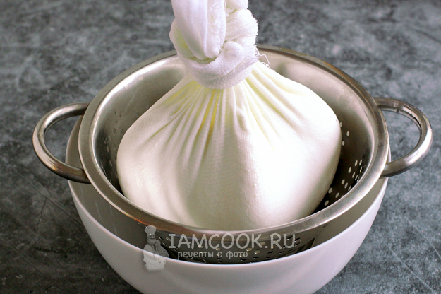 Теперь нужно сыр хорошенько отжать от сыворотки. Сначала пусть она стекает свободно, позже можно помочь ей стекать, сдавливая комочек и закручивая марлю вокруг своей оси.