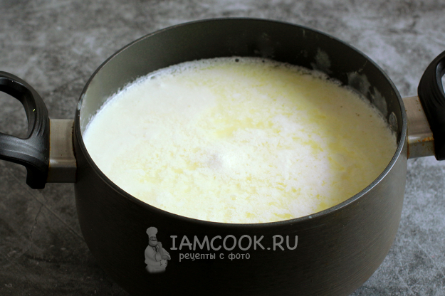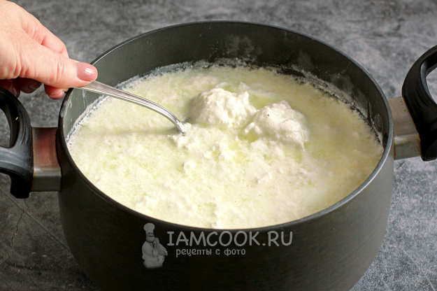 Лучше сделать огонь минимальным и нагревать простоквашу медленно. Если есть градусник, то до 75 градусов, а если его нет, то ориентиром будет служить опущенная до самого дна столовая ложка. Выньте ложку из кастрюли и коснитесь ее губами: если будет очень горячо, то выключите нагрев. До кипения доводить ничего не нужно, это важно. Жидкость всё время находится на границе между кипением и нагревом. Если простокваша перекипит у вас, то сыр получится жесткий, с твердыми крупинками.
