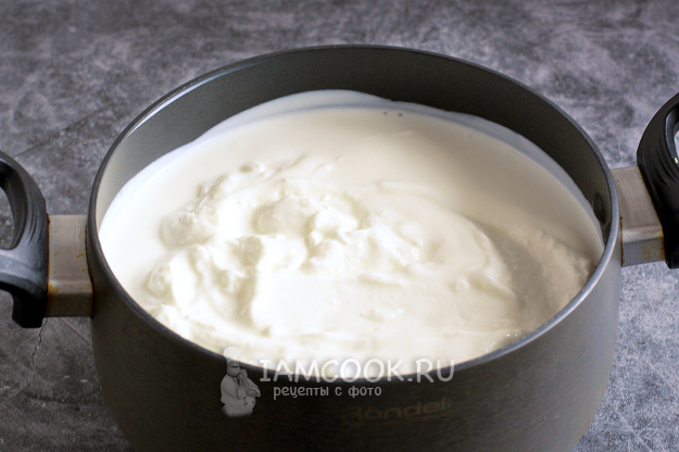 Не ворошите простоквашу ложкой и не перемешивайте. Можно только аккуратно отодвигать ее по краям кастрюли, пока на поверхности не появится сыворотка. Время нагрева может быть разным и зависит от количества продукта и от силы нагрева.