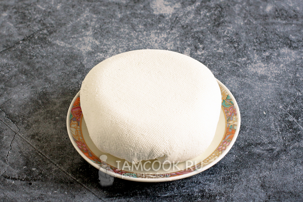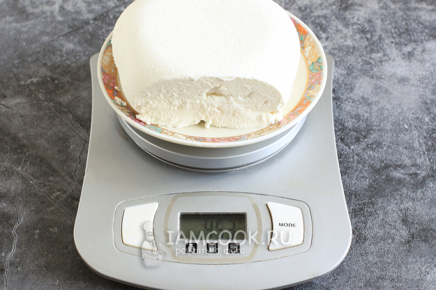 Далее сформируйте в марле гладкий комочек сыра и придавите его грузом. Всю эту конструкцию поставьте в холодильник и периодически проверяйте. Стекающую жидкость сливайте и снова ставьте в холодильник. Выдержка - примерно, от 12 часов до суток. Плотность сыра будет зависеть от времени прессования.