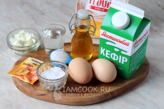 Для приготовления творожных блинов на кефире необходимы следующие ингредиенты. Яйца вымойте под холодной проточной водой, можно с использованием соды. Подсолнечное масло используйте рафинированное (без запаха), кефир у меня 2,5%, но подойдёт абсолютно любой, творог - домашний. Все продукты должны быть комнатной температуры.