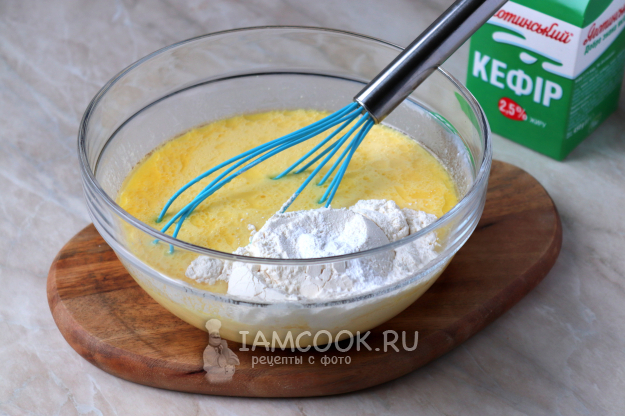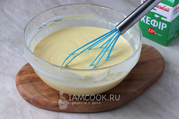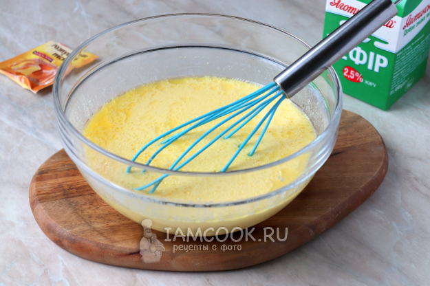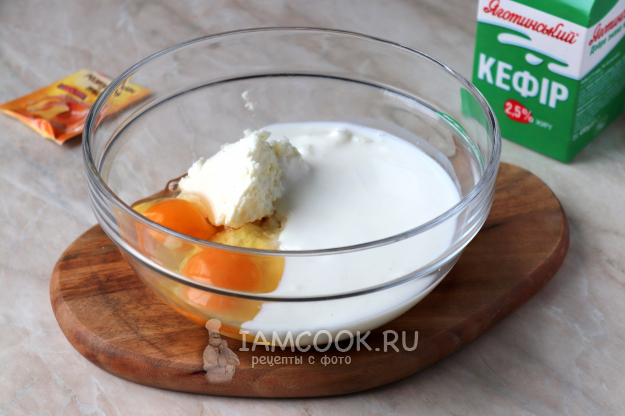 Соедините в глубокой миске кефир, творог, куриные яйца, сахар и щепотку соли.
