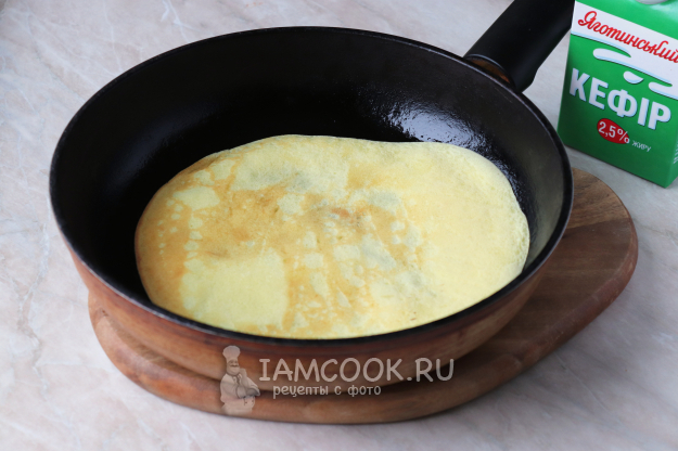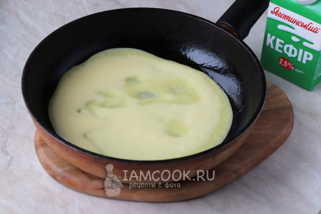 По истечению времени вылейте половину стандартного половника теста на хорошо разогретую с растительным маслом сковороду. Распределите его по всему дну.