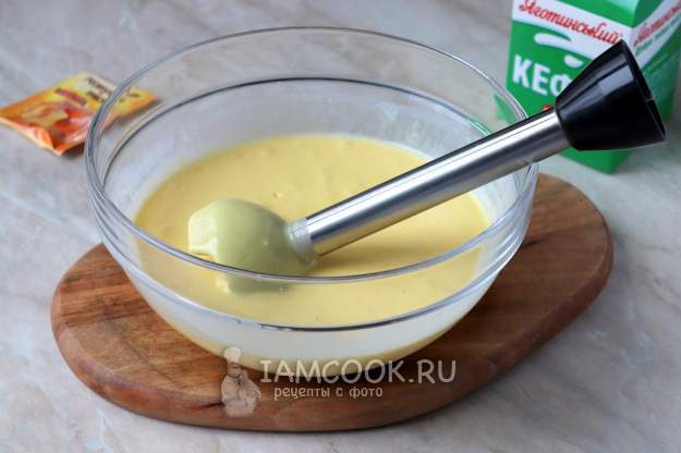 Погружным блендером взбейте массу до однородного состояния. Если у вас нету блендера, тогда перетрите творог через мелкое сито и только потом соедините его с остальными продуктами, перемешайте венчиком.