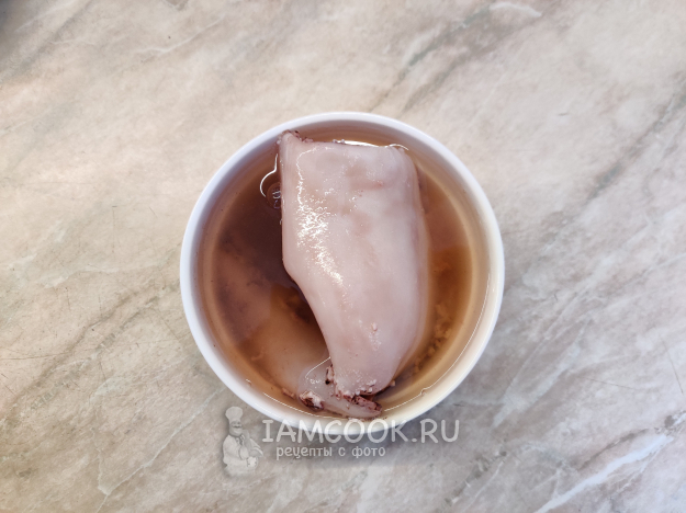 Если у вас неочищенные кальмары, сначала обдайте их кипятком, а затем промойте тушки под проточной водой.