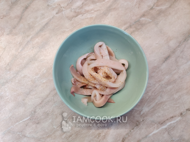 Кальмаров нарежьте на кольца толщиной около сантиметра.