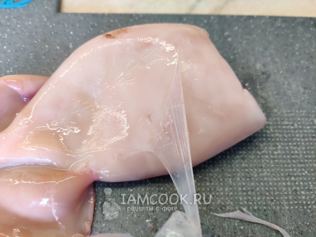 Далее предлагаю снять с кальмаров плёнку. Если её оставить, кальмары будут жёсткими.