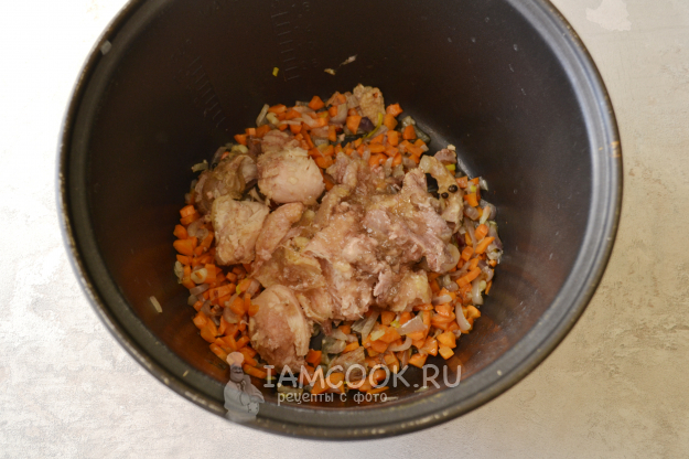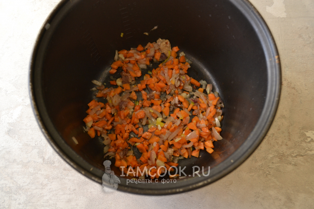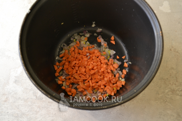 Крышку мультиварки не закрывайте, обжаривайте лук 5-6 минут, помешивая, затем добавьте к нему очищенную и нарезанную мелким кубиком морковь.
