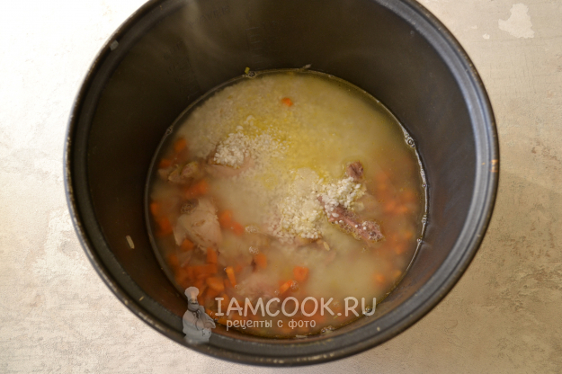 Залейте горячей водой и посолите. Установите режим "рис" на 30 минут.