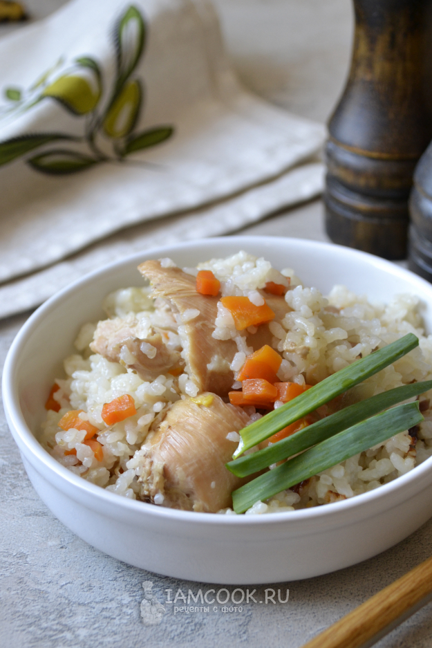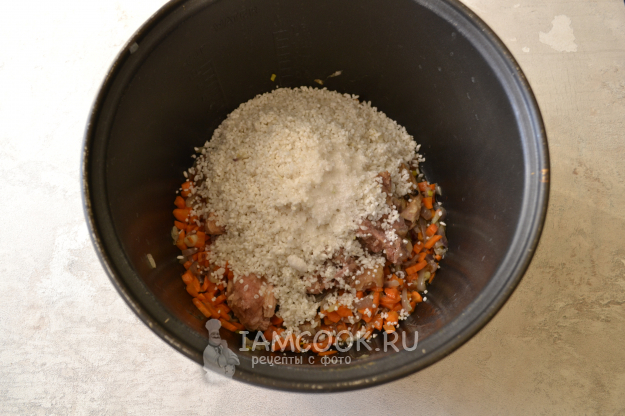 Промойте рис, меняя воду несколько раз, пока она не станет прозрачной. Промытый рис засыпьте в чашу.