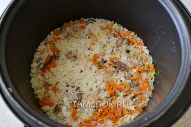 Спустя указанное время, после сигнала мильтиварки, рисовая каша с тушенкой готова.