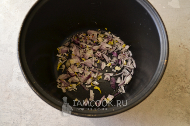 Очистите лук и мелко нарежьте. Влейте в чашу мультиварки растительное масло, установите режим "жарка" и отправьте в нее лук.