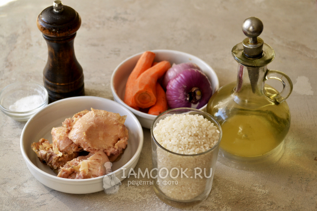 Подготовьте необходимые продукты для приготовления риса с тушенкой в мультиварке по списку. Тушенку можно использовать любую, главное, чтобы она была качественной. У меня в рецепте - куриная тушенка.