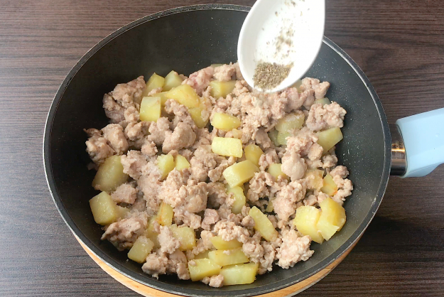 Добавьте фарш, обжарьте, помешивая, до готовности. Посолите и поперчите по вкусу. По желанию добавьте любимые специи.
