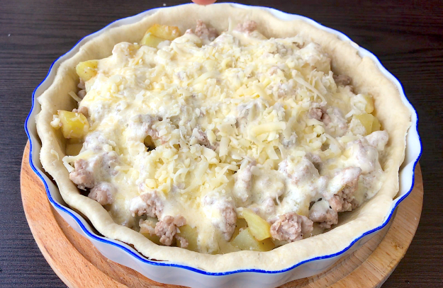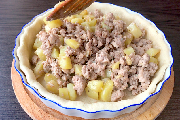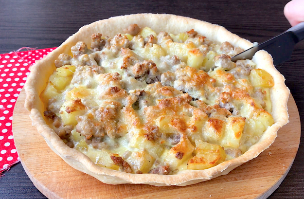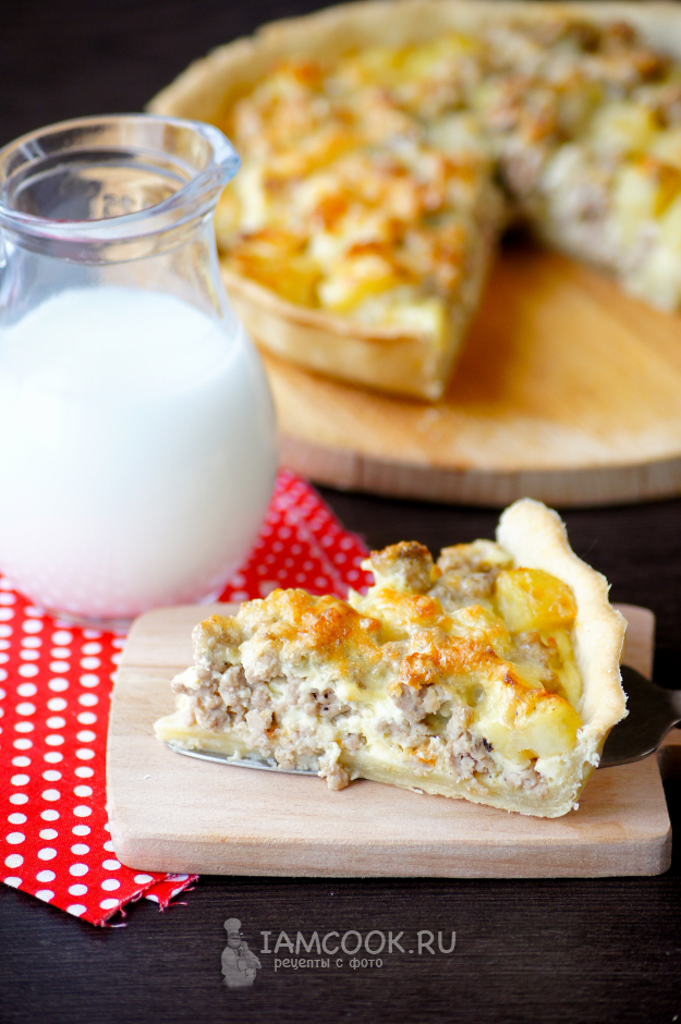 Вкусный, ароматный киш с фаршем и картошкой готов.