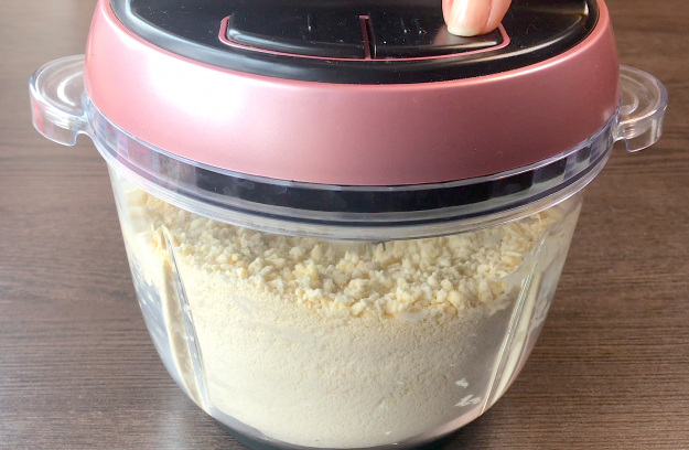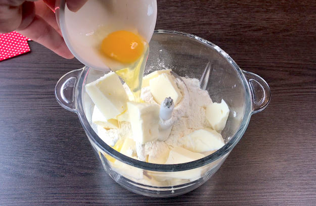 Для начала всыпьте муку в чашу блендера, добавьте холодное сливочное масло, вбейте яйцо.