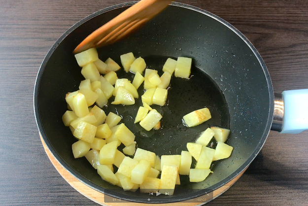 Очистите картофель и нарежьте на маленькие кубики. Обжарьте на растительном масле до румяности.
