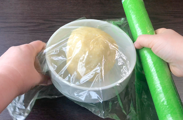 Поместите тесто в миску и накройте пищевой пленкой, поставьте в холодильник на 30 минут.