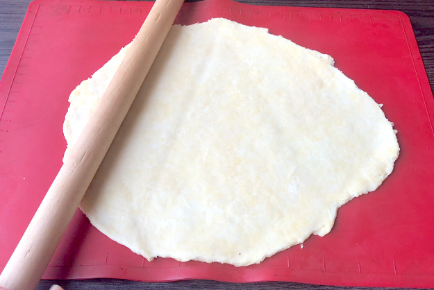Тесто раскатайте в тонкий пласт, диаметр должен быть больше формы.