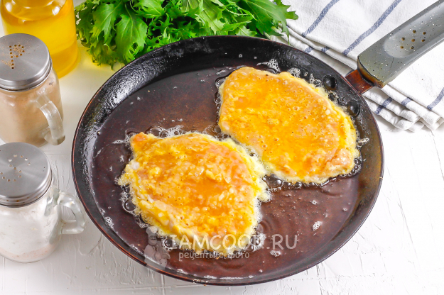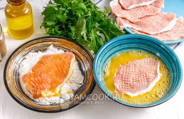 В отдельной глубокой емкости взбейте куриное яйцо с солью и молотым черным перцем. Я добавляю специи в яйцо, но вы можете обмазать ими каждый отбитый кусочек мяса с обеих сторон - это по желанию. На тарелку высыпьте пшеничную муку. Обмакните ломтик мяса во взбитое яйцо, затем в муку и снова в яйцо. Можно и наоборот - сначала в муку, затем в яйцо. Главное, чтобы последней была яичная масса.