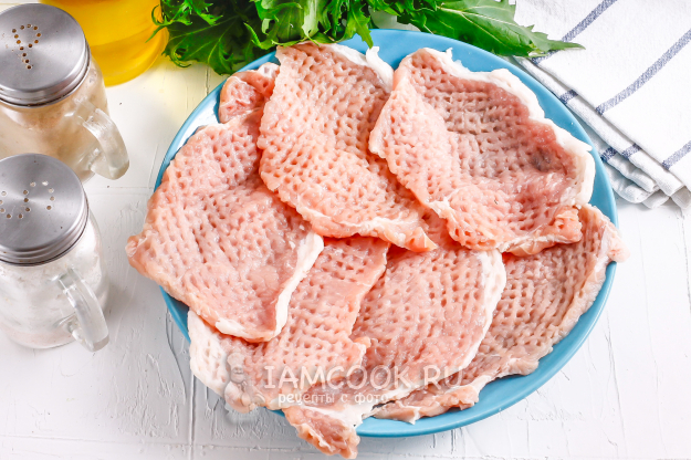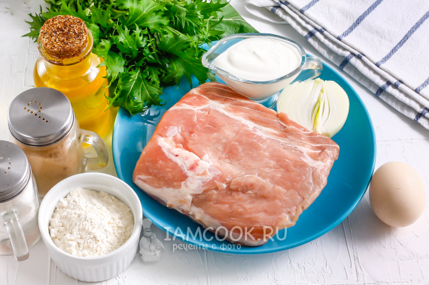 Возьмите необходимые ингредиенты для приготовления отбивных из свинины в сметанном соусе.