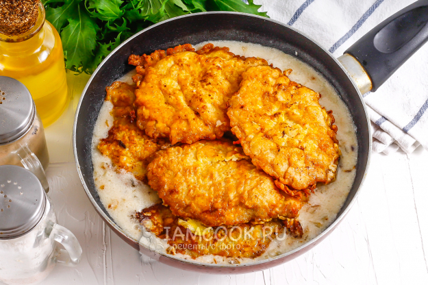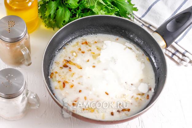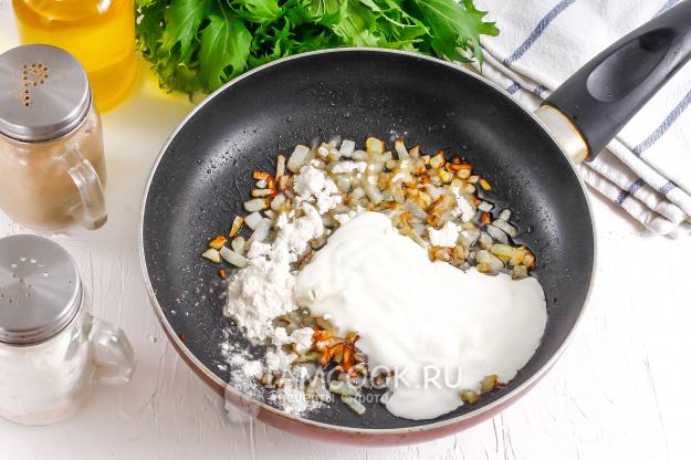 Выложите сметану любой жирности и всыпьте муку, оставшуюся от панировки отбивных. Аккуратно перемешайте.