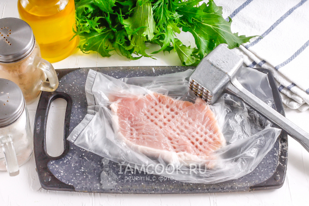 Отбейте с обеих сторон кухонным молоточком. Лучше всего использовать для этих целей целлофановый пакет - этим вы избавите себя от мытья доски, рабочей поверхности и молоточка.