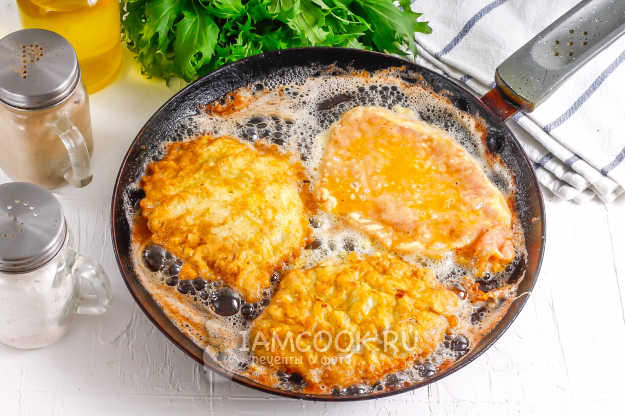 Затем переверните на другую сторону и обжарьте такое же количество времени. Таким образом приготовьте и остальные заготовки, выкладывая жареные отбивные на тарелку.
