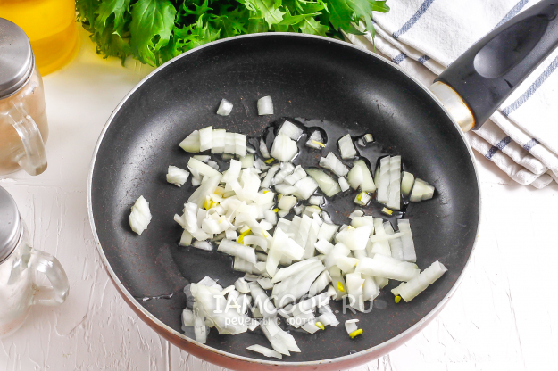 Очистите репчатый лук, промойте и половину нарежьте мелкими кубиками. По желанию вы можете добавить больше лука. Обжарьте луковую нарезку в растительном масле на сковороде в течение 3-5 минут до румяности.