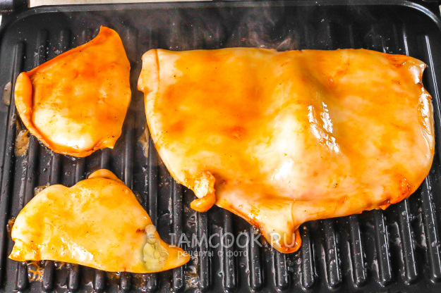 Раскалите электрогриль и смажьте растительным маслом его панели. Выложите на них замаринованных кальмаров и закройте крышку. Обжарьте кальмаров на электрогриле примерно 3 минуты и попробуйте проткнуть мясо кальмара деревянной шпажкой. Оно должно быть мягким и легко протыкаться. Если оно жесткое, то обжарьте еще 1 минуту. Помните, что эти морепродукты легко пережарить и тогда мясо также станет жестким, как резина. Тут нужно понять путем проб и ошибок - у каждой техники разная мощность! Желательно сначала выложить на электрогриль небольшую часть тушки и прожарить 3-4 минуты, попробовать на вкус и понять, сколько времени требуется для приготовления. Затем жарить большую часть морепродуктов, чтобы не рисковать и не испортить их все сразу.