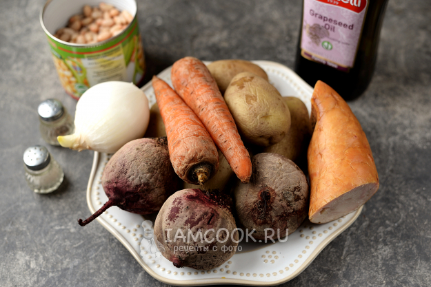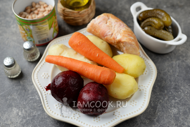 Подготовьте необходимые продукты для винегрета с колбасой. Овощи помойте под проточной водой жесткой кухонной губкой, сложите в глубокий казан или кастрюлю и отварите до готовности. Картофель и морковь будут готовы минут за 15-20, свекла сварится минут за 40-50, зависит от размера овощей.