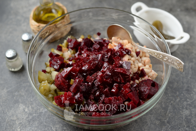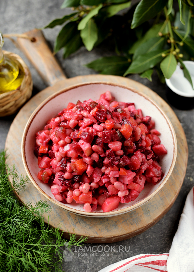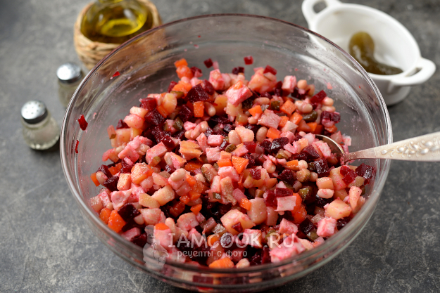 Хорошенько перемешайте винегрет и сразу же подавайте к столу.