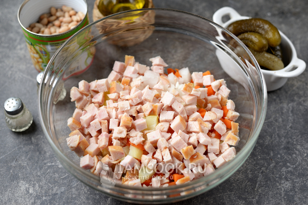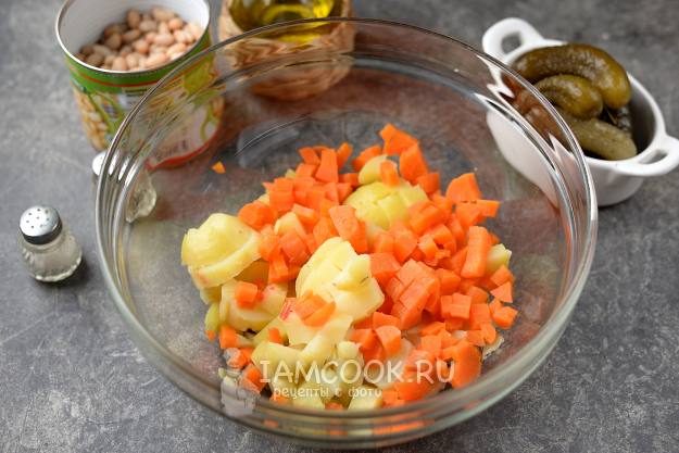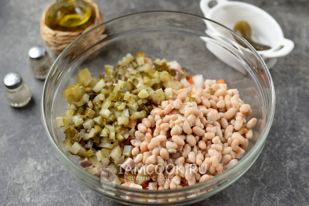 Слейте с фасоли соус, огурцы кислые также нарежьте кубиком, переложите в миску к овощам.