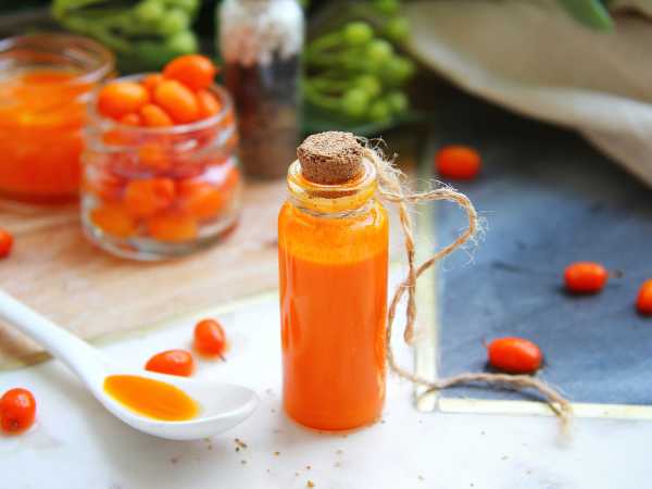 По истечении суток чайной ложкой соберите масло с поверхности сока. Оно выглядит как ярко-оранжевый слой с бархатистой структурой. Перелейте масло в чистую посуду, желательно из темного стекла. Сделанное в домашних условиях облепиховое масло хранится в холодильнике в течение 2 недель максимум.