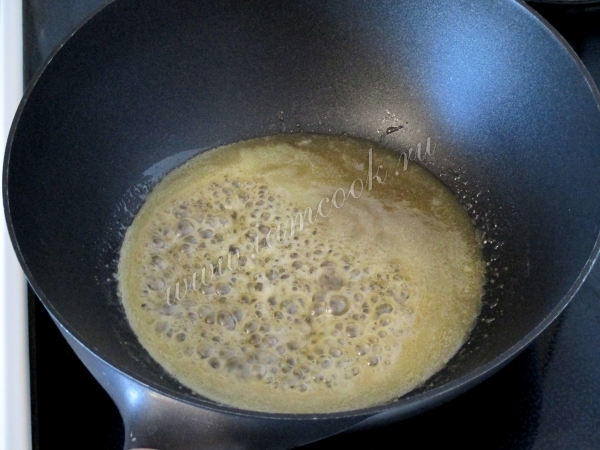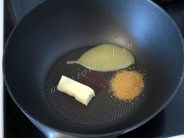 На сковороде нагрейте мед, масло и демерару или сахар.