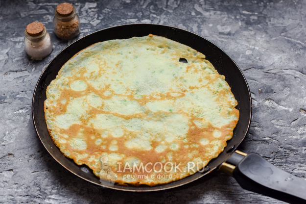 Сковороду разогреть, можно смазать немного маслом. Влить в сковороду немного теста, жарить блинчик до румяности, по 20-30 секунд с каждой стороны.