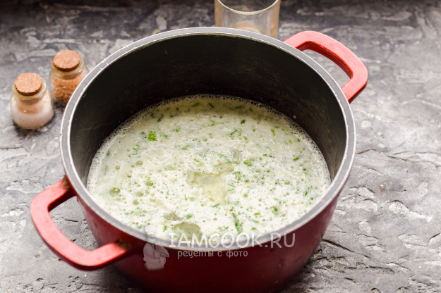 Перелить основу в глубокую емкость, сразу добавить растительное масло, кипяток.
