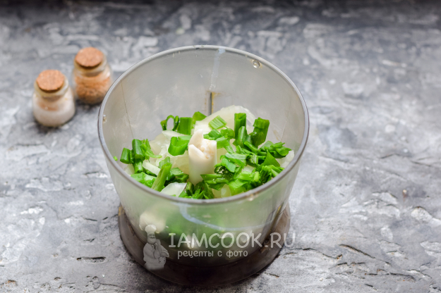Очистить репчатый лук и ополоснуть. Нарезать лук мелкими кубиками и переложить в чашу блендера. Также нарезать произвольно зеленый лук, положить в чашу блендера.
