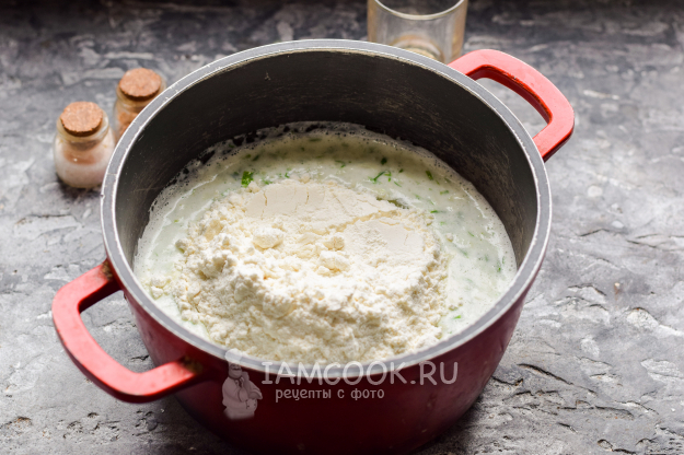 Всыпать пшеничную муку, перемешать все ингредиенты, чтобы не было комочков. Можно воспользоваться миксером или венчиком.