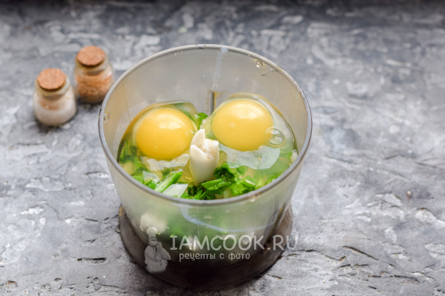 Вбить к луку, в чашу блендера, два куриных яйца.