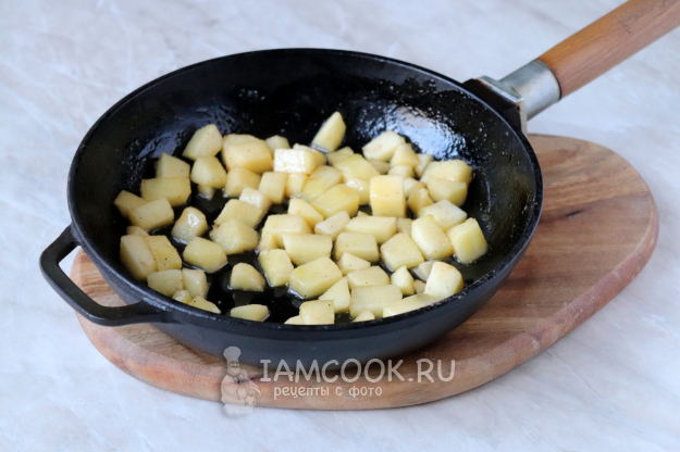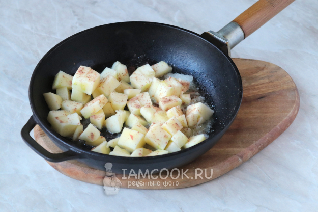 Яблоко очистим от кожуры, удалим семенную коробочку, а мякоть нарежем средними кубиками. Фруктовую нарезку переложим в сковороду с растопленным маслом. Добавим немного молотой корицы.