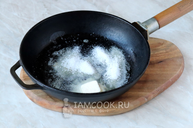 А пока займёмся яблоками. В сковороде растопим сливочное масло и добавим сахарный песок (1-2 ст.л.).