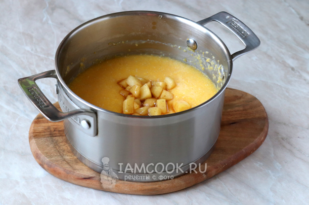 По истечению времени откроем кастрюлю с кашей и переложим туда карамелизированные яблоки вместе с сиропом, который остался в сковороде. Аккуратно перемешаем.