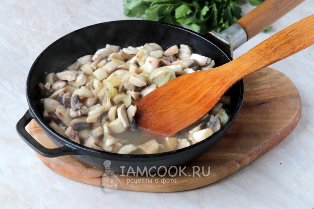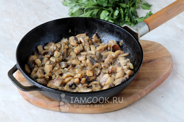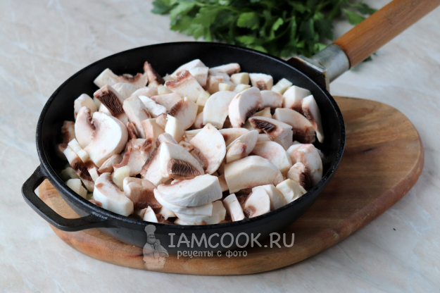Очищенные шампиньоны нарежьте кубиками или слайсами и добавьте к луку. Посолите и поперчите по вкусу.